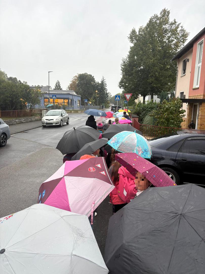 auch bei Regen machten sich die Kinder und Lehrkräfte am vergangenen Donnerstag zur Fuß auf den Weg zur Eichendorffschule. Von vier verschiedenen Treffpunkten aus starteten die Schülerinnen und