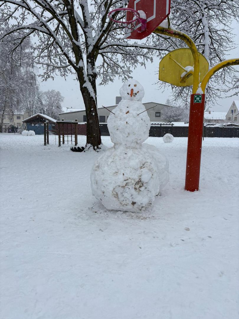 Die Kindern der Eichendorffschule bauen einen riesigen Schneemann in der Pause